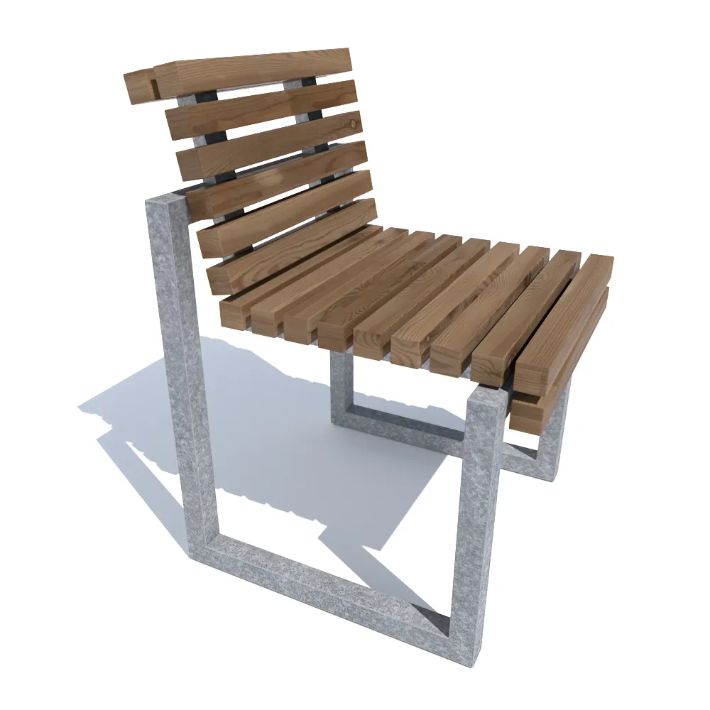 Stolen har en enkel men elegant design med sits och ryggstöd i kraftiga träribbor. Ryggstödet sträcker sig hela vägen ner till sitsen och viker av bakåt i en 90-gradig vinkel i överkant, vilket ger extra stöd och komfort. Sitsen viker av på samma sätt i framkant, vilket ger ett ombonat intryck. Konstruktionen vilar på fyrkantsprofiler i stål, vilket ger en stabil och hållbar bas.